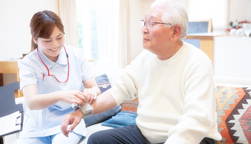 利用者様のご自宅や居住施設に訪問し、医師の指示のもと、健康状態のモニタリングや点滴、創傷管理、薬の服用指導管理といった医療処置をはじめ、ご家族も含めたメンタルケアや生活環境支援を行うことで、安心して日常生活をお過ごしいただくためのフォローをおこないます。
